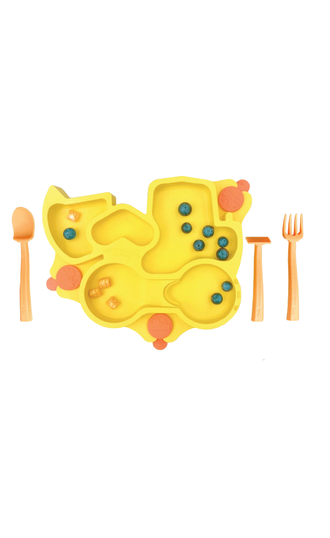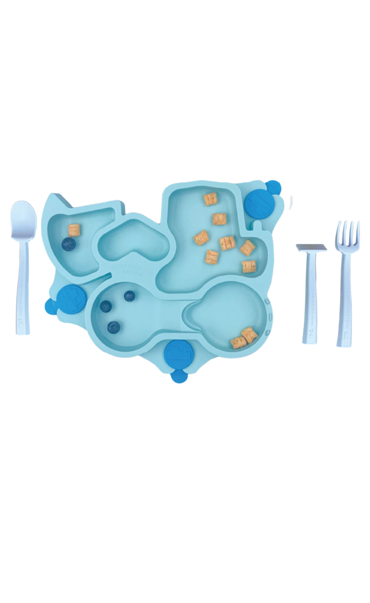The set is designed to fit and work together. The plate has divided sections with specific locations for Fork, spoon and pusher.